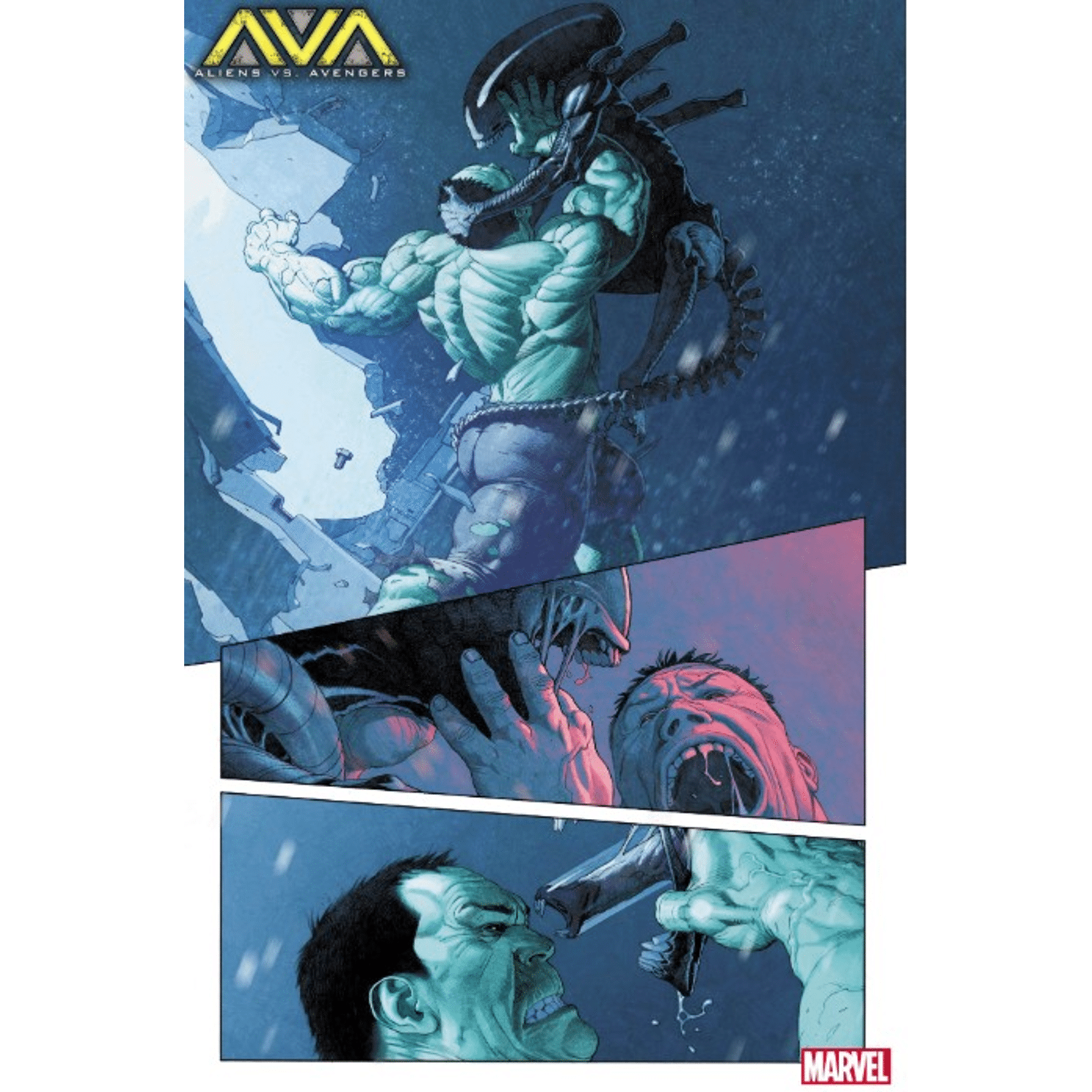 Aliens VS Avengers 01 SC - De Xenomorfen bereiken de aarde, en dit perfecte organisme ontmoeten de machtigste helden van de aarde. De Avengers, nu een mix van zowel oude als nieuwe leden, moeten zich verenigen om deze dodelijke buitenaardse dreiging het hoofd te bieden. Terwijl de Xenomorfen hun angstaanjagende kracht ontketenen, is het een race tegen de klok om ze te stoppen voordat ze de verdedigingen van de aarde vernietigen. De Avengers staan oog in oog met de huiveringwekkende realiteit dat zelfs hun grootste krachten misschien niet genoeg zijn om deze buitenaardse wezens te verslaan. Wie zal er als eerste vallen in dit epische conflict van alien horror en superhelden kracht?