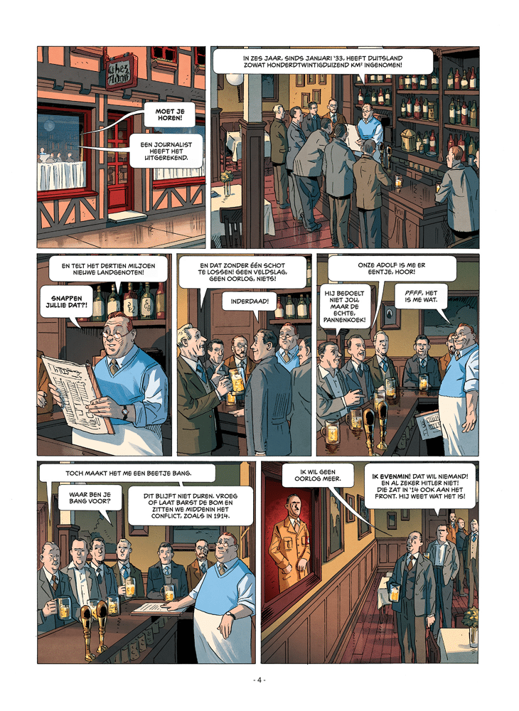 Chez Adolf 02 HC - 1939 - Het klimaat in Duitsland wordt steeds grimmiger. Nog maar weinigen durven zich openlijk te verzetten tegen het naziregime dat zich voordoet als de redder van het land en met ijzeren vuist alle sectoren van het politieke en bestuurlijke leven regeert. Te midden van dit alles probeert professor Karl Stieg, een alledaagse en terughoudende man, de storm te overleven door te zwijgen en weg te kijken. Maar hoelang kan hij zijn ogen sluiten voor het onrecht dat hem omringt?