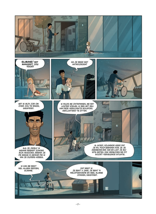 De Reuzen 02 SC - Siegfried - Siegfried is enig kind. Zijn ouders zijn Duitse diplomaten, dus hij zit vaak alleen thuis met zijn begeleider, want door zijn handicap zit Siegfried in een rolstoel. Hij heeft een heel sterke band met water. De jongen brengt zijn tijd het liefst thuis door in hun ultrabeveiligde zwembad, als hij niet surft op het duistere water van het darknet. En dan ontmoet hij Adryel en begint hun avontuur. Misschien zorgt zijn reus er wel voor dat Siegfried weer vrij kan bewegen en eindelijk kan ontsnappen uit zijn gouden kooi!