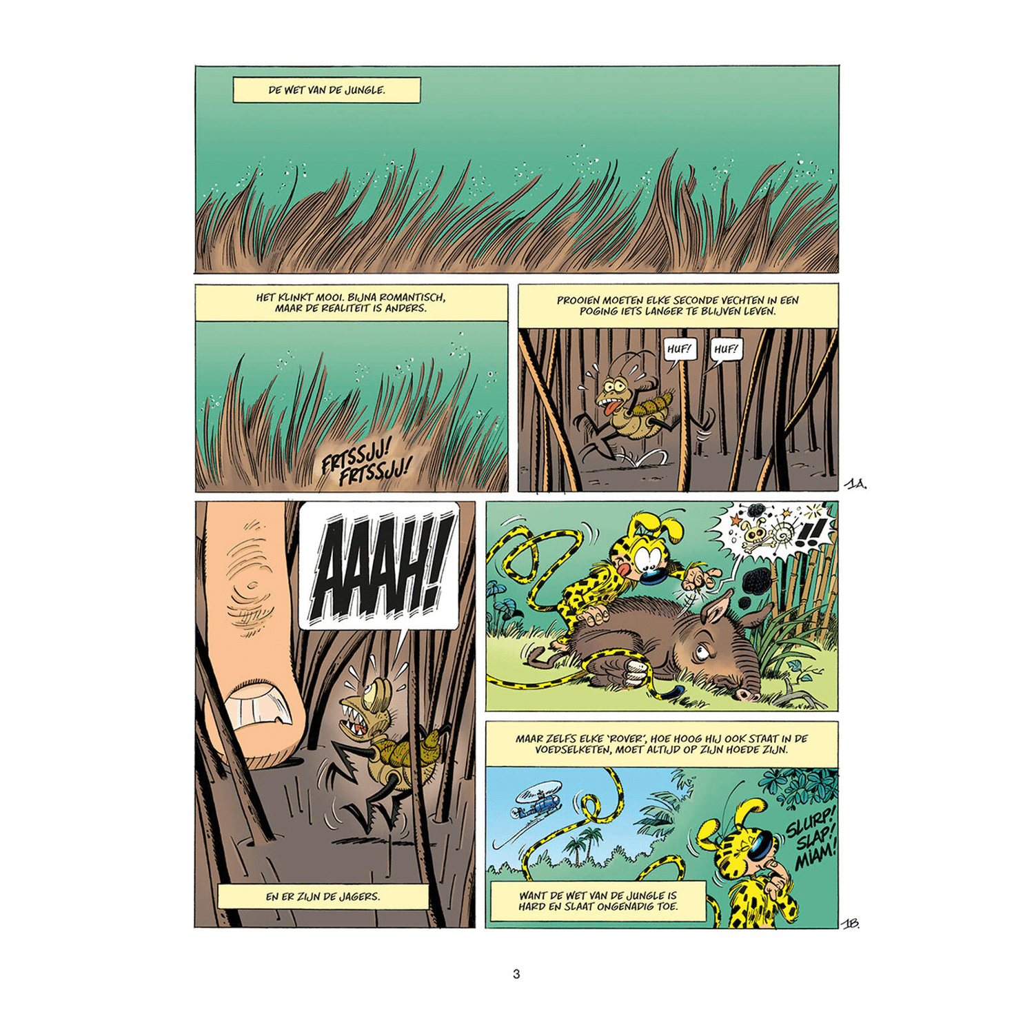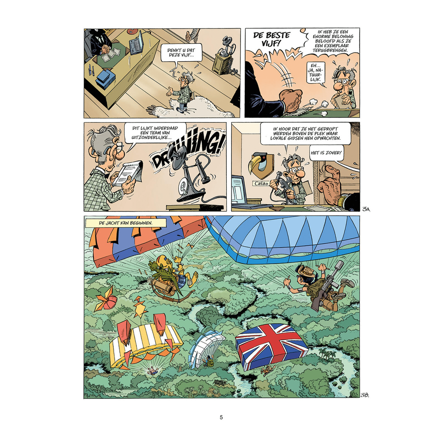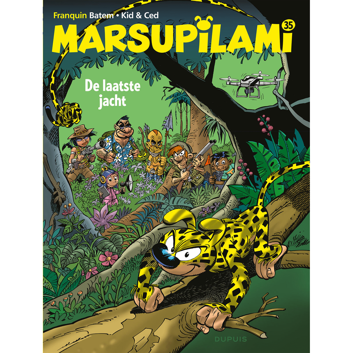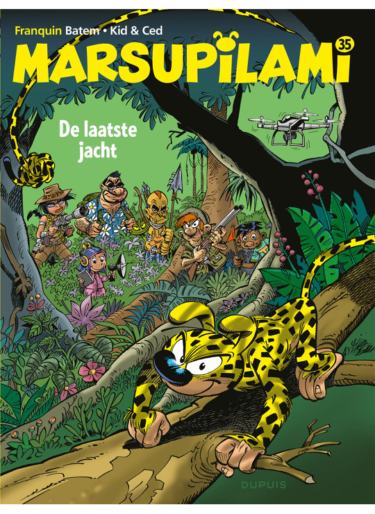 Marsupilami 35 SC - De Laatste Jacht - In het nieuwste avontuur, De Laatste Jacht, zien we jager Bring M. Backalive terug. Hij is een van de vijf beste jagers ter wereld die door een mysterieuze opdrachtgever naar Palombië worden gestuurd met één doel: een marsupilami vangen! "Back alive, een bekende vijand van de Marsu, laat zich dit keer bijstaan door de verschrikkelijke Estefania Forbalez, de zachtmoedige Léon de Bourgogne, de wrede Parhavi en de jonge Violette Delacourt met haar drones. De marsupilami lijkt kansloos tegenover zo’n vastberaden team met een haast oneindig arsenaal aan jachttechnieken. Bovendien worden de vijf gegidst door Tattoo, een jonge chahuta die thuis is in de jungle en aan de kant staat van de jagers... of niet?