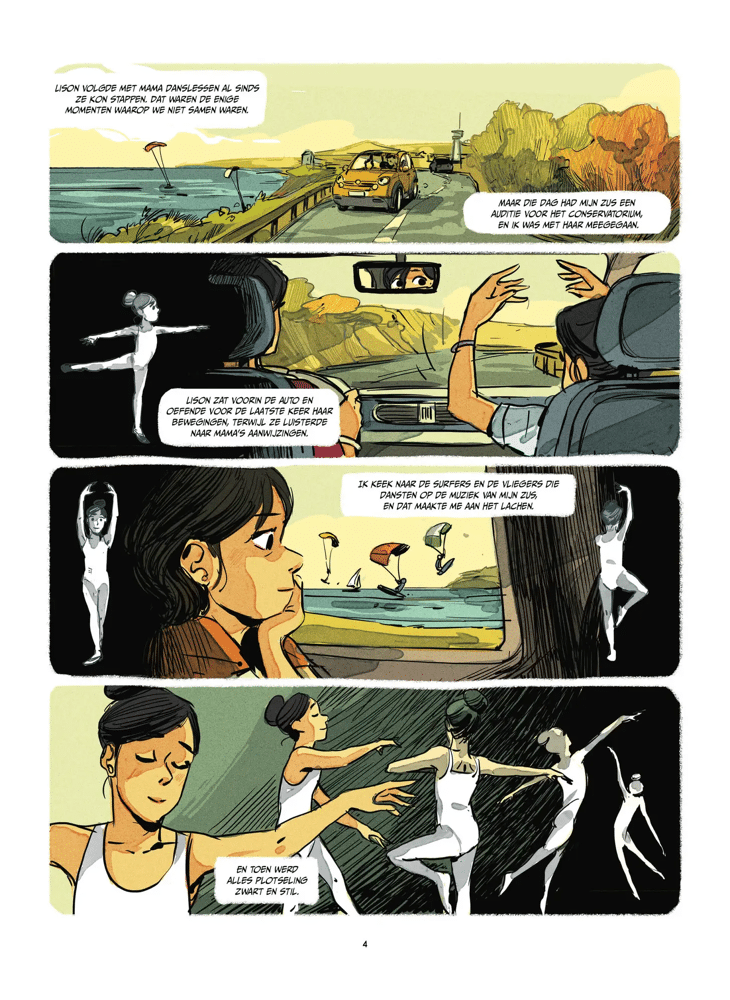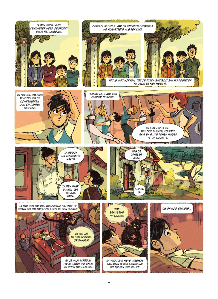Colette is elf en heeft altijd in de schaduw van haar tweelingzus Lison geleefd: de mooiste, de meest talentvolle, de ster van de klassieke dans. Tot het noodlot toeslaat. Lison sterft bij een auto-ongeval; hun moeder overleeft, maar verliest een arm én lijkt tegelijk haar “lievelingskind” kwijt te zijn. Sindsdien staat Colette’s leven stil: ze voelt zich klein, wordt op school bekeken als “dat fragiele meisje” en probeert, vooral voor haar moeder, de dans voort te zetten waarin Lison uitblonk. Alleen: Colette’s verdriet krijgt letterlijk een stem, want haar schaduw praat tegen haar en jaagt haar voortdurend op.