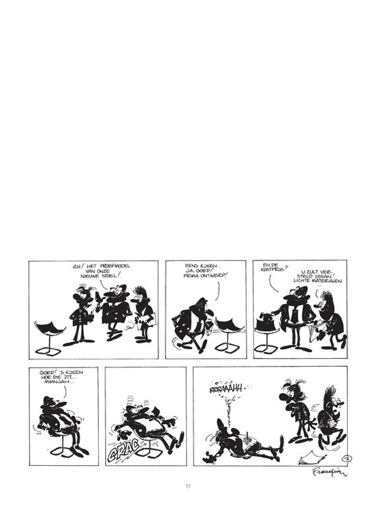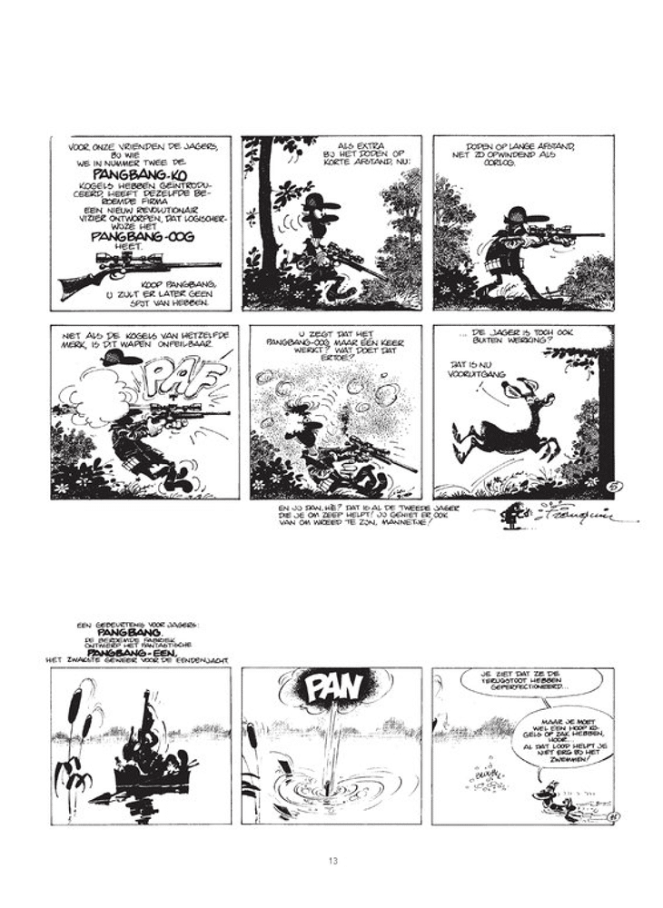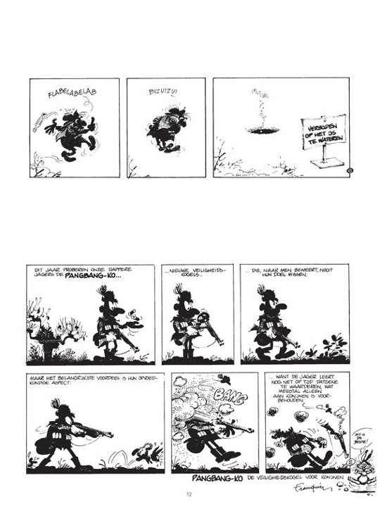 Tussen humor en horror, absurditeit enmaatschappijkritiek, gebruikt Franquin zijn sublieme tekenstijl om diep menselijkethema’s aan te snijden: oorlog, milieu, religie, de dood en domheid – alleskrijgt een veeg uit de pan.